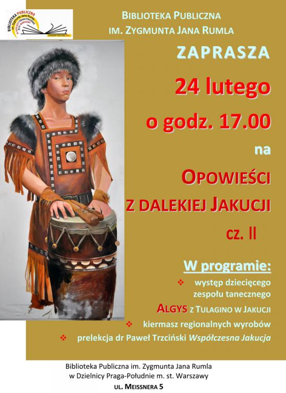 W poniedziałek 24 lutego o g. 17:00 w Bibliotece na Meissnera 5 wieczór jakucki: występ dzieci z Jakucji, prelekcja dr Pawła Trzcińskiego "Współczesna Jakucja" oraz jarmark wyrobów syberyjskich.