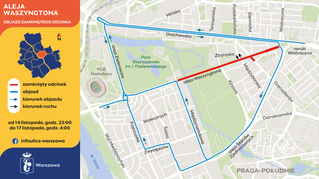 Objazd wyznaczono aleją Zieleniecką i ulicą Grochowską. Z ronda Wiatraczna, Ostrobramskiej czy Rozłuckiej kierowcy pojadą aleją Stanów Zjednoczonych do Międzynarodowej i alei Waszyngtona. Z ulicy Saskiej objazd poprowadzi ulicami Zwycięzców i Francuską do ronda Waszyngtona.