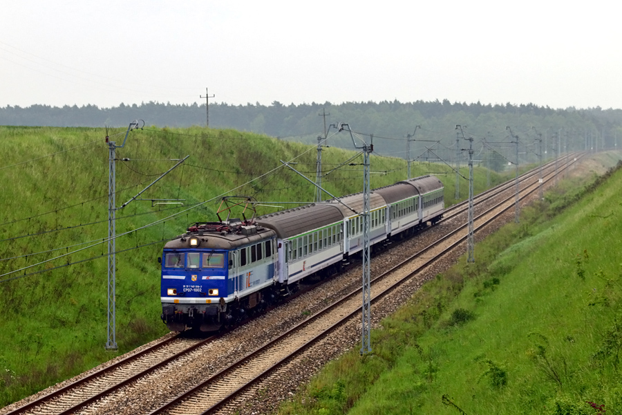 EP07-1002 ciągnie pociąg TLK "Wybicki" relacji Kraków Główny - Poznań Główny. Zdjęcie wykonano na szlaku podg Sprowa - podg Starzyny, 26.05.2016r.